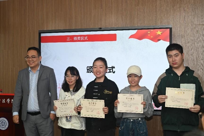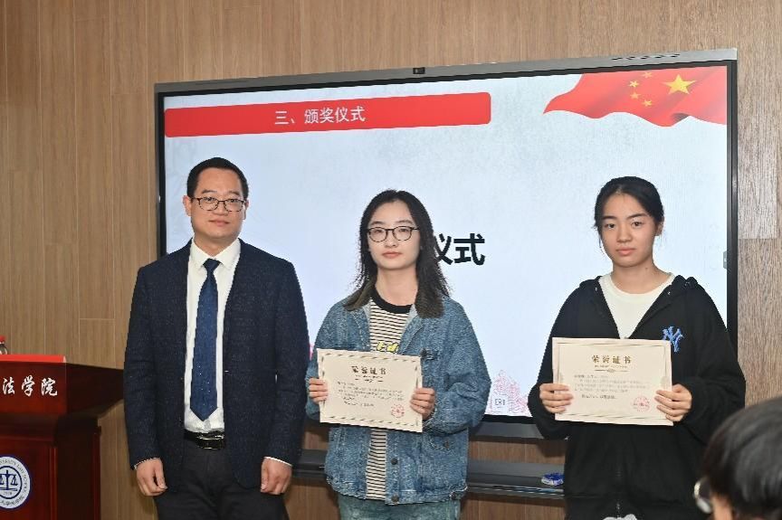 在颁奖环节,上海铸达律师事务所党支部书记桑海滨、创始合伙人戚建国、合伙人刘华北、校党委研工部副部长席慧霞、校学工办副主任何卓衡、分别为第二届“法学新星”学术论坛获奖同学颁奖。